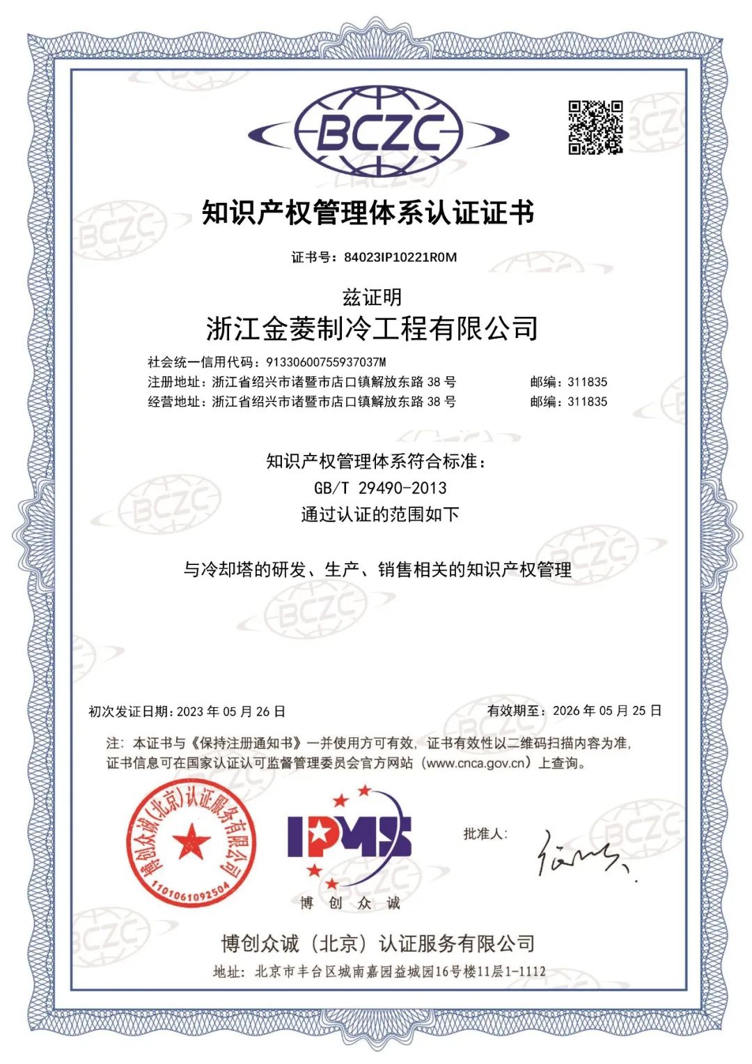 喜报 | 浙江金菱取得知识产权管理体系认证证书